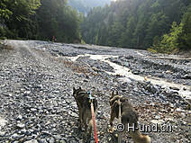 Diese ersten 2,5 km mit nur leichter Steigung hinter uns lassend ging es weiter dem Bauchlauf, mal lauter mal leiser vom Wassergetöse, der gross Scheri entgegen. Bei warmen Wetter da unbedingt in dem davor flachem Stück die Hunde nochmals ausgiebig ins Wasser lassen. Danach folgt ein Wegstück etwas erhöht und vom Bach entfernt.