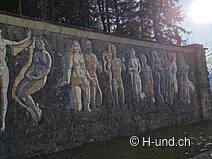 Die linke Wand des Monuments stellt das erdverbundene Leben dar: Das Menschenpaar in seinem Sein und Werden, Liebe und Zeugung. Die rechte Wand ist dem geistigen Leben gewidmet: Die Erwachenden, die Ringenden, die Schauenden und die Aufgehenden. Das unvergleichliche Kunstwerk regt an zur Meditation und Reflexion über uns und unsere Gesellschaftsformen auf dem Weg zum umfassenden, schaffenden und guten Menschen. Quelle: schweizmobil.ch