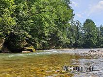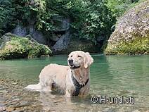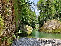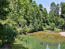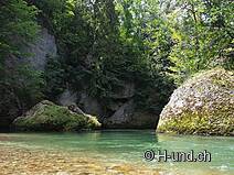 Dann öffnet sich uns eine wunderbare Schlucht - die Aeulischlucht. Ein Traum. Das Naturschutzgebiet (Leinenpflicht) ist einzigartig und das türkisfarbene Wasser lädt auch uns zur Abkühlung ein. Es ist richtig kalt und wer über Wasserschuhe verfügt sollte diese unbedingt mitnehmen.