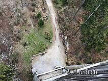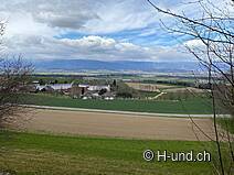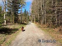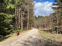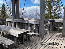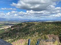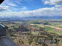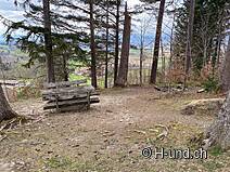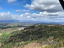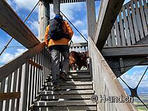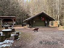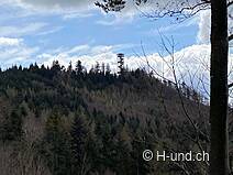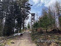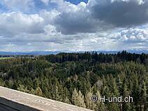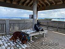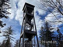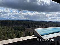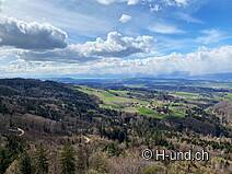 Nun führt uns ein Wanderweg aufwärts bis zum Chutzeturm auf 819m. Auch hier hat es eine Feuerstelle und viele Informationen über den höchsten Holzturm der Schweiz. Die 234 Eichenstufen sind auch gut mit Hund zu überwinden. Zuoberst auf dem 40m hohen Turm hat man eine atemberaubende Sicht in alle vier Himmelsrichtungen. Als wir uns satt gesehen haben, wandern wir im Wald zurück und kommen noch an der Chutzehütte vorbei. Auch hier hat es eine grosse Feuerstelle. Die Hütte mit WC kann beim Chutzenturmwart gemietet werden.