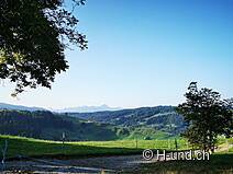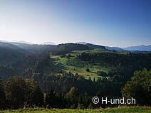 Gegen Süden öffnet sich auf der Brandhöchi der Blick auf Säntis, Hochalp und Speer. Östlich zeigt sich das Dorf Hemberg.