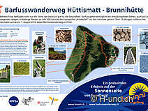 Der Barfusswanderweg startet bei der Hüttismatt und führt auf einem bestehenden Wanderweg hinauf in Richtung Brunnihütte. Nach der Hälfte der 1000 m langen Wegstrecke zweigt der neue Barfusswanderweg auf das Trassee des bestehenden Schlittelweges ab.