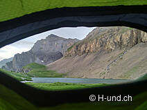 Übernachtung in der Hütte möglich ( Onlinereservation ) Aber da Hunde im Schopf übernachten müssen, schlagen wir unser Nachtlager auf der anderen Seite vom See auf und erfrischen uns im kalten See.