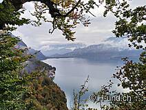 Parkieren kann man im Parkhaus ( ganzer Tag 7.- ) bei der Beatenbucht, wo sich die Standseilbahn befindet und auch gleich der Wanderweg beginnt. Wir folgen dem Wegweiser Richtung Beatushöhlen. Der Weg ist schön breit und führt leicht aufsteigend in den Wald hinein, der allmählich sein schön gefärbtes Herbstlaub abwirft . Schon zu Beginn, ist Naturschutzgebiet und Hunde sind an der Leine zu halten.