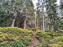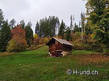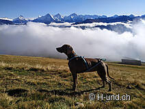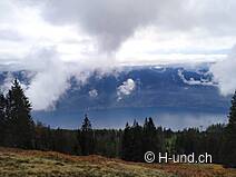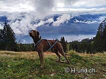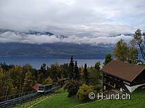 Unterwegs kann man durch die Bäume hindurch einen Blick auf den Thunersee werfen und gemütliche Plätze laden zum verweilen ein. Nach einer Weile teilt sich der Weg und wir folgen dem Richtung Beatenberg. Wer möchte kann sich auch nur die Beatushöhlen ansehen, die natürlich auch einen Besuch wert sind. Bis auf den Beatenberg, führt der Weg fast nur durch den Wald und zwischendurch kommt man mal an ein paar hübschen Häuschen und der Standseilbahn vorbei. Auf dem Beatenberg besteht die Möglichkeit einzukehren. Da es für mich mit dem grossen Hotel und der Altenresidenz etwas zu touristisch wirkt, zieht es uns weiter Richtung Niederhorn, dass noch im dicken Nebel steckt. Ab hier führt die Route stetig weiter nach oben über Stufen und Weiden, was schon ziemlich in die Beine geht. Aber der Weg ist super ausgebaut und mit Hund gut machbar.