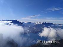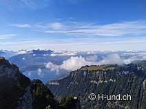 Pünktlich zur Ankunft drückt sich die Sonne durch, der Nebel verschwindet wie weggezaubert und man erhält ein wunderschönes Bergpanorama bis hin zum Thunersee. Wer möchte kann sich da im Restaurant stärken oder auch ausserhalb auf den verschiedenen Bänken und Sonnenliegen verweilen. Wir geniessen draussen die wärmende Sonne, bis der Nebel wieder aufzieht und gehen dann mit der Gondel / Standseilbahn wieder runter. Wer nicht den ganzen Weg hoch gehen möchte, hat auch die Möglichkeit bis auf Beatenberg oder Vorsass zu fahren. Wir waren auf der ganzen Route nach oben allein unterwegs. Da es im Sommer weidende Kühe hat und touristisch ein gut besuchter Ort ist, empfiehlt es sich die Wanderung im Herbst und unter der Woche vorzunehmen.