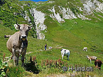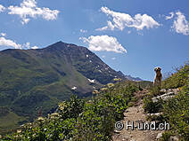 Nachdem wir die Aussicht auf dem Leuchtturm geniessen durften, machen wir uns nun auf den Weg zum Tomasee. Direkt ab Parkplatz führt der Wanderweg entlang einem Quellbächlein, wo sich Kaya an diesem sonnigen Sommertag nochmals richtig erfrischen kann. Zweidrittel des Weges ist konstant ansteigend auf einem gut präparierten Wanderweg. Dadurch dass es nicht so oft geregnet hat und der Weg an prallem Sonnenhang liegt, erinnert dieser zum Teil sandige Boden an südliche Destinationen. Links und rechts des Weges zeigt uns jedoch die herrlich blühende Flora (Alpenrosen, Margriten, weisses Wollgras) die Pracht der Schweizer Alpen. Das überqueren der Kuhherde ist problemlos, sogar für unsere eher ängstliche Hündin Kaya. Geführt an der kurzen Leine mit zielorientierten Schritten geht das tiptop. Zwischendurch überqueren wir immer wieder Quellbäche, daher ist gutes Schuhwerk (auch wasserdicht) von grossem Vorteil, auch wenn es heute nicht so viel Wasser hat.