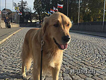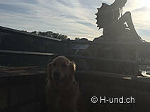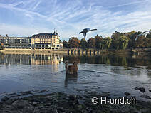 Etwas später führt der Weg in den Wald und von dort gibt es immer wieder Bademöglichkeiten. Hier darf der Hund auch ab der Leine, er sollte jedoch abrufbar sein. Danach kommt ein kurzer Anstieg vorbei am „Höllhooge“, dies ist ein steil abfallender Muschelkalkfelsen. Das Haus, ein altes Fischerhaus ist heute ein Wohnhaus mit Künstleratelier. Rings um das Grundstück entdeckt man immer wieder coole Kunstwerke. Bald kommen wir zum Adelberg, hier kann die eine schöne Aussicht auf die Schweizer Altstadt genossen werden. Burton ist jetzt normalerweise recht müde, als wir jedoch die Brücke in Richtung Rheinfelden Schweiz überqueren, zieht er in der Mitte in Richtung Inseli. Hier, wo ganz früher einmal eine Burg stand, ist nämlich ein weiterer Lieblingsstrand von ihm. Wir können uns also auch hier noch ein bisschen erholen und im Wasser planschen. Danach geht’s gerade aus wieder Richtung Bahnhof. Als Alternative könnte man nun auch rechts zur Schifflände laufen und dort das Schiff in Richtung Basel nehmen.