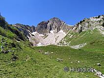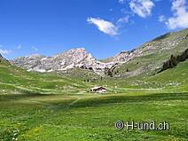 Der öffentliche Parkplatz befindet sich mitten in einer Alpweide. Deshalb parkierte ich etwas unterhalb, weil ich mein Auto eigentlich gerne wieder ganz in Empfang nehme. :-). So müssen wir über die besetzte Alpweide. Die Kühe / Rinder sind zwar neugierig aber nicht aufdringlich.