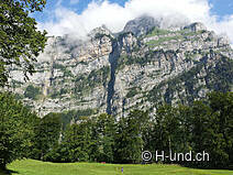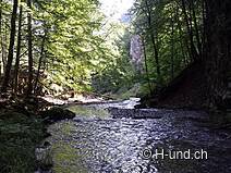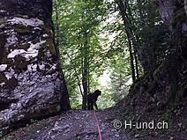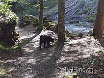 Auch wenn die Route zum grössten Teil im Wald ist, lohnt es sich an heissen Tagen früh loszuziehen: Gerade das erste Stück ist stark besonnt. Tim und ich waren bereits um 8:30 Uhr oben auf der Schwammhöhe beim Restaurant. Dieses öffnet erst um 9 Uhr, trotzdem bekam ich netterweise einen Kaffee. Diesen genoss ich bei wunderbarer Aussicht auf den Klöntalersee. Es folgte der Abstieg zum See. Dann passierte es: Irgendjemand unten am See, musste bereits einen «Knaller» loslassen. Von da an bockte Tim. Er wollte nicht mehr runter zu See, sondern wieder zurück. Aber das wollte ich nicht. Also musste er wohl oder übel mit mir absteigen – und ich hoffte inständig, dass es bei diesem einen Knall blieb – so war es denn auch. Zum guten Glück. Wir liessen es deswegen aber bleiben noch einen Abstecher in den See zu machen, sondern stiegen gleich durch das Löntschtobel ab. Die Strasse ist hier zum Teil zwar recht nah und man hört sie hin und wieder, dafür ist die Landschaft wirklich sehr reizvoll. Ich finde es lohnt sich voll und ganz. Hier trifft man auf mehr Menschen, als während des Aufstieges.