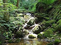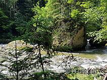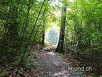 Ab hier geht es erfrischend im Schatten der Bäume und der Sihl entlang. Bei der ersten Brücke gehen wir gerade aus. Überrascht, dass uns niemand in diesem Paradies begegnet, ist dies wohl dem Wochentag zuzuschreiben. In verschiedenen Blogs haben wir gelesen, dass hier durch Tunnels und vorbei an alten Grabsteinen zu laufen sei. Der Weg ist ziemlich neu gemacht und schlängelt sich nun zwischen Sihl und Tunnel hindurch. Grabsteine sehen wir praktisch keine mehr. Wir geniessen diese Ruhe, den Waldduft und halten zwischendurch bei den Bänkli an um dem Rauschen des Flusses zuzuhören - also ich. Kaya erfreut sich der stetigen Abkühlung im Wasser. Nach ca. 1 Stunde gäbe es die Möglichkeit zur Bäsebeiz abzubiegen. Wir laufen weiter, da wir unseren Proviant im Rucksack mittragen und die Bänklipausen bevorzugen. Ab Sihlmatt wird das Sihlbett immer enger und wildromantisch zeigen sich hier paradiesische Stellen, perfekt zum Grillen und Baden geeignet. Auch wir geniessen hier unsere Mittagspause (Restaurant Sihlbrugg wäre ab da ca. 15-20 Minuten entfernt) . Beim Sihlsprung über die Gitterbrücke laufen wir in einem märchenhaften Zauberwald wieder der Sihl entlang, diesmal flussabwärts. Auf dieser Seite gibt es noch viel mehr schöne Stellen um zu verweilen. Je nach Wasserstand sind grössere Kiesbänke und/oder kleine Lagunen ersichtlich. Hier begegnen wir auch mal weiteren Zeitgenossen. Via Sihlmatt beim Schiffli wieder angekommen, überqueren wir hier nun die Brücke wo uns der gleiche Weg wieder nach Sihlbrugg Dorf / Dukes führt.