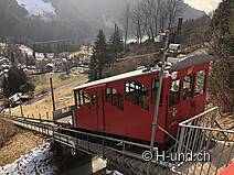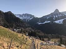 Weiter führte der Weg in einem leichten Auf und Ab durch schöne Fichtenwälder. Es lohnt sich, bei der Lichtung Nahe Punkt 1196 kurz innezuhalten und nochmals die atemberaubende Aussicht auf den Dent de Jaman zu geniessen. Ab hier führt der Weg hinunter zur Bergstation der Standseilbahn Sonloup. Wir mochten die 20 Minuten nicht warten (das Bähnli hat die Bergstation bei Ankunft gerade verlassen) und sind so dem Wanderweg hinab ins Dorf Les Avants gefolgt.