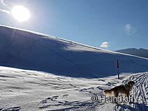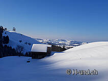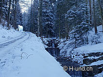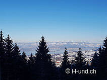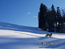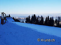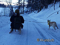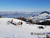 Der Weg ab Hütten liegt sehr schattig, heisst gutes Schuhwerk wegen Rutschgefahr empfehlenswert. Dem Örischwandbach entlang bis nach Ober Oerischwand sind wir im Schatten unterwegs. Doch die kurze Ansteigung hilft bei - 4 Grad nicht zu frieren. Ab Ober Oerischwand strahlt uns die Sonne entgegen und wir erfreuen uns diesem herrlichen Panorama Richtung Zürich, hoch über dem Zürichsee. Im Gasthaus Rossberg werden wir von herzlichen Gastgebern bedient, sogar Kaya erhält ihren extra Napf im Restaurant (welches übrigens auch Abends geöffnet hat - Nachtschlitteln ;-) ). Im Gasthaus sind auch für kurzentschlossene wenige Mietschlitten vorhanden. Wir haben unsere Schlitten selber mitgebracht und nach einer wärmenden Suppe geht es ab an den Startplatz. Vorsicht: die Strecke wird auch befahren (zwar eher wenig doch trotzdem gut auf Gegenverkehr aufpassen). Unser "Schlittenhund" Kaya geniesst diese leicht abfallende Strecke (ca. 3 Km) in vollen Zügen und zwischendurch halten wir an um diese wunderschöne Aussicht zu geniessen.