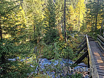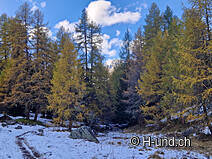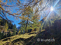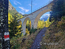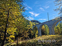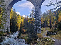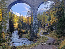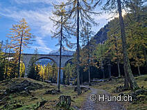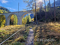 Accompanied by the Unesco World Heritage route of the Räthische Bahn, we can't get out of our amazement. This dreamlike nature of golden larch forests, bridges over little brooks and paths high above ravines in constant change is truly unique. Three times we walk under the sky-high viaducts.