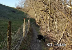 We started in Morlon at the Hotel Le Gruyerin. At the hotel there are a lot of parking lots, I suppose it is no problem to park there. The landlady is very friendly and tries to speak German if you don't speak French. Besides you eat very well there. I would say that it is rather a high class cuisine, but you can eat without any problem with hiking boots and appropriate clothes. :) From there a small nature path goes directly down to the lake. At the lake there are also enough free parking lots. It was very impressive to see Lake Gruyère without water, there was only a small and a bigger stream running through the lake, nothing more. At the parking place at the lake there is a small information board. We walked along the lake towards Echarlens. This path was beautiful and you could see again and again the impressive pictures of the drainage. After about 2.5 km we walked slightly up the mountain and we came to a field landscape. Just follow this path until you reach the junction. At the junction you have to turn left and then you come to a country road with light traffic (take your dog on a leash, because the road is very confusing). If you follow this road, you will come back directly to the Hotel Le Gruyerien.