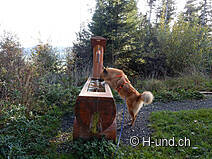 The road now led along the moorland. Finally we came across the first fountain with running water. Right next to the fountain was also the first turnstile, which led us onto the meadow path. Uphill, we then crossed the pasture. The pasture was like all the other pastures we had encountered, grazed and without livestock. At the top, Belina treated herself to a drink of water from the well. Next to it was a very inviting fireplace.