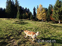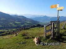 It didn't take long until we had left Rothenthurm behind us and the path led us past farms and cow pastures. The cows were grazing peacefully in their fenced pastures and even a farm dog, which was watching us as we passed, was not bothered by us. My gaze was fixed on the Morgartenberg, which stretched out to our left and in the morning sun made the forest glow in its autumn colors.