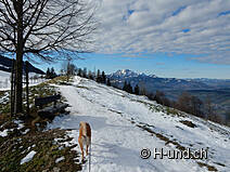 With the first ride of the cable car, it goes for me and Belina from Küssnacht am Rigi high to Seebodenalp. Right at the top station and the parking lots is the signpost Panoramarundweg and at the same time the beginning of the "Gletscherspur". As the name suggests, the trail leads past 15 remnants of the ice age. Signs inform about the events more than 24,000 years ago and their traces in nature.