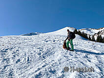 We park our car on the public pay parking lot of the Turren cable car in Lungern. The cable car climbs steeply and gives a clear view over the whole of Lungern with the reservoir. Arrived in Turren we mount our snowshoes and off we go towards the First. In Turren there is a restaurant and also overnight accommodations. We take the steeper ascent first. We prefer to take the less steep way on the way back. The ascent is not without difficulty, but it is declared as an easy route, perhaps also because it is the shortest tour. We take it because Kesh is already 12 years old. But there would be more demanding tours to choose from. When we reach the ridge, an incredible panorama opens up! We recognize Meirigen - Hasliberg and the Titilis. We continue to an alp with the name First. Here it has a nice chapel and also a bench to rest. It even has a public toilet elevated that it can be reached even with more snow. Now we take the path back, it is less steep and makes many turns. Happily we reach tours again. Here it still has a Sesseli and Gondeli and a gondola from earlier, when there was a ski resort here, exhibited. But just because it is now no longer a ski resort, we find it very relaxing and recommendable here for a snowshoe tour!