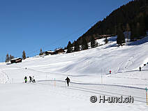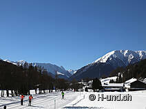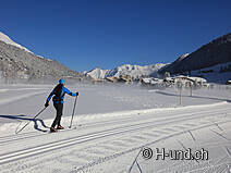 Le départ est donné au célèbre restaurant d'après-ski "Bolgen Plaza", non loin de la gare de Davos Platz. De là, le sentier commence à plat jusqu'à la station de vallée du télésiège "Carjöler", qui transporte les amateurs de sports d'hiver au Jakobshorn. De là, le sentier monte sur quelques mètres jusqu'à une petite colline au-dessus du village de Hof, d'où il descend ensuite légèrement jusqu'au Brüchweg. Vous y trouverez le rustique Restaurant Islen, avec ses fines spécialités grisonnes et sa terrasse ensoleillée qui vaut toujours le détour. Après un court ou long repos, on traverse la Landwasser et de là, la piste de ski de fond mène en descente douce sur environ un kilomètre le long de la rivière jusqu'à Davos Frauenkirch. Une station de bus se trouve juste à côté de la piste, qui ramène confortablement les skieurs de fond sur la Davos Platz. Pour les skieurs en forme, il existe également la possibilité de revenir au point de départ en ski de fond.