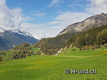 Comme il est déjà presque midi, nous achetons quelque chose à manger et à boire dans le magasin du village et nous nous asseyons sur un banc. Les chiens dorment paisiblement à côté de nous pendant le pique-nique. Après Guarda, nous commençons la descente vers Lavin. Ici, nous rencontrons d'autres randonneurs pour la première fois. Jusqu'à présent, nous étions toujours seuls. Lorsque nous regardons en arrière quelque temps plus tard, nous voyons Guarda magnifiquement situé sur une terrasse ensoleillée. Ce point de vue est vraiment écrasant.