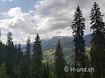 De l'autre côté, nous traversons alternativement une forêt sombre et des pâturages luxuriants en montant et descendant régulièrement jusqu'à la clairière Uf Wald. Ici, nous trouvons un endroit parfait pour dormir à 18h50. De là-haut, nous avons une vue magnifique sur la vallée de Schanfigg en direction de Coire. Nous ne montons pas la tente ce soir, nous dormons simplement dans nos sacs de couchage, nous écoutons les bruits de la nature et nous profitons du ciel étoilé. Plus tard dans la soirée, il commence à pleuvoir, mais comme notre lieu de sommeil est couvert, nous sommes bien protégés et restons au sec.