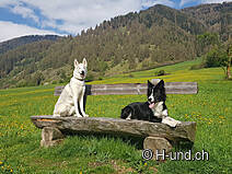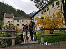 Nous commençons notre aventure "Jakobsweg Graubünden" au monastère de Son Jon (patrimoine mondial de l'UNESCO) à Müstair, à la frontière avec l'Italie. Après avoir obtenu le timbre du pèlerin, nous commençons à marcher. Le chemin de gravier nous conduit principalement hors de la route principale vers les petits villages de Sta. Maria et Valchava. Ensuite, nous marchons sur une route goudronnée qui monte régulièrement au-dessus d'une prairie jusqu'à ce que nous atteignions une forêt de mélèzes merveilleusement parfumée. Les chiens sont particulièrement heureux que le chemin de la forêt commence ici et que nous n'ayons plus à marcher sur l'asphalte. A l'entrée de la forêt, nous rencontrons un bûcheron avec son Border Collie, qui s'intéresse particulièrement à Mia. Nous continuons sur le chemin forestier jusqu'à Fuldera et ensuite à Tschierv. Nous passons devant plusieurs bancs avec une boîte pleine de livres fournis par une bibliothèque. Un endroit idéal pour s'attarder et oublier le temps.