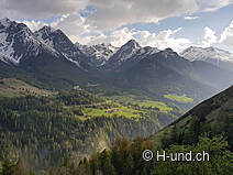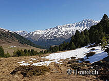 Nous commençons l'étape d'aujourd'hui tôt le matin. Après avoir pris le petit déjeuner, démonté la tente et rangé toutes les affaires dans les sacs à dos, nous commençons à marcher à 7h40. Le soleil brille et il fait déjà agréablement chaud. Le chemin est magnifique et nous mène à travers le Val S-charl, sauvage et romantique. Partout sur le chemin, les marmottes nous accueillent avec des sifflets puissants. Seule la neige nous rend la tâche difficile. À chaque pas, nous nous enfonçons et parfois nous restons coincés dans la neige jusqu'aux genoux. Pour les chiens, c'est aussi très fatigant. Après un peu plus d'une heure, nous atteignons l'Alp Astras, où nous faisons une courte pause. En été, des produits frais sont disponibles ici, mais pour le moment, l'alpage est fermé. Ensuite, nous descendons régulièrement à travers la plus haute forêt de pins d'Europe jusqu'au village idyllique de S-charl, une ancienne colonie de mineurs. La première moitié de ce chemin nous prend beaucoup de temps, car le chemin forestier est encore couvert de beaucoup de neige. À l'exception de quelques heures d'ensoleillement, ce versant oriental est à l'ombre la plus grande partie de la journée.