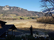 Nous avons commencé à Morlon à l'hôtel Le Gruyerin. L'hôtel dispose de nombreuses places de parking, je suppose qu'il n'y a pas de problème pour s'y garer. La propriétaire est très sympathique et essaie de parler allemand si vous ne connaissez pas le français. La nourriture est excellente. Je dirais qu'il s'agit plutôt d'une cuisine haut de gamme, mais on peut manger sans problème avec des chaussures de randonnée et des vêtements appropriés. :) De là, un petit sentier naturel descend directement vers le lac. Au lac, il y a également suffisamment de places de parking gratuites. C'était très impressionnant de voir le Greyerzersee sans eau, il n'y avait qu'un petit et un grand ruisseau traversant le lac, rien de plus. Sur le parking au bord du lac, il y a un petit panneau d'information. Nous avons marché le long du lac en direction d'Echarlens. Ce chemin était magnifique et on pouvait voir encore et encore les photos impressionnantes de l'assèchement. Après environ 2,5 km, il a légèrement monté et nous sommes arrivés dans un paysage de champs. Il suffit de suivre ce chemin jusqu'à la bifurcation. Au carrefour, vous devez prendre à gauche et vous arrivez sur une route de campagne avec un trafic de voitures léger ( il est obligatoire de prendre le chien en laisse, car la route est très confuse ). Si l'on suit cette route, on revient directement à l'hôtel Le Gruyerien.