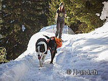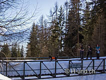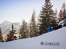 A pied, vous marchez en direction de Rischinen jusqu'à l'embranchement Tschuggen. Là, dans le coin, le sentier de raquette commence à travers la forêt jusqu'à ce que vous atteigniez le pont sur le ruisseau Bruchji. En ce moment, il y a beaucoup de neige et la rampe est pour ainsi dire enneigée. Le pont est en acier et stable, donc pas de problème. Le sentier se poursuit avec une vue imprenable sur Rischinen/Blatten jusqu'au hameau Egga. Le trajet de Blatten à Egga dure environ 1 heure. Vous y trouverez le Bergführerstübli, qui est normalement ouvert à partir de 14 heures et qui vous invite à rester un peu. Il vous invite à rester et les chiens sont les bienvenus.