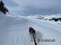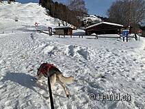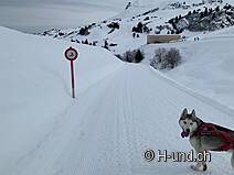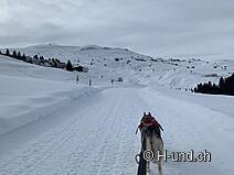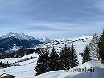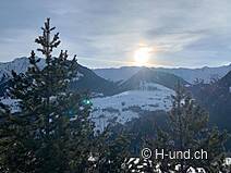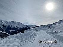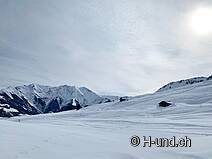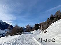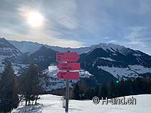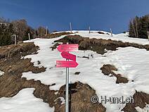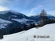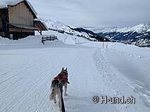 Nous avons pleinement profité de la solitude sur cette partie du chemin. Nous avons donc bien progressé. Sauf que Fenja a trouvé des pistes de jeu instructives ou que j'avais besoin d'une pause pour profiter de la vue. Bientôt, nous avons atteint la traversée vers le domaine skiable d'Obersaxen. Peu avant, cela vaut la peine de faire un détour par la chapelle Sogn Carli (qui y aurait aussi un barbecue, mais qui était encore couverte de neige).