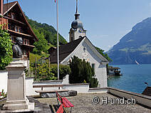 Alle 7.30 abbiamo svuotato il nostro posto letto e continuiamo a camminare sul sentiero di ghiaia lungo il fiume Reuss. Dopo 45 minuti raggiungiamo la riva del bellissimo lago di Uri dopo Seedorf. D'ora in poi siamo sulla "Via Svizzera". Per il 700° anniversario della Svizzera, è stato creato un sentiero di 35 km intorno al lago di Uri, progettato da tutti i cantoni svizzeri. A ciascuno dei cantoni fu affidato un tratto di sentiero segnato da pietre di confine, la cui lunghezza dipende dal numero dei suoi abitanti con 5 millimetri a persona. Sulla strada, passiamo varie pietre di confine, la prima delle quali appartiene al cantone di Berna. Il percorso conduce comodamente sempre lungo la riva del lago, in parte su asfalto, in parte su un sentiero di ghiaia. Inoltre, non è così rumoroso come il giorno prima, perché il traffico stradale scompare nel tunnel di Seelisberg e la ferrovia prende l'altro lato del lago di Uri.