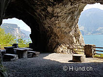 Un'ora dopo raggiungiamo il piccolo insediamento di Isleten. Qui ci sdraiamo nel prato in riva al lago e facciamo il bagno. Mia si gode questa pausa al massimo e ci segue felicemente in acqua. Dopo esserci asciugati al sole, ci concediamo una deliziosa colazione proprio accanto sulla terrazza del ristorante Seegarten. In seguito continuiamo la nostra escursione alle 10.40. Il sentiero continua lungo la riva del lago di Uri. Per due volte attraversiamo un tunnel con diversi sfondamenti di roccia, che offrono sempre nuove, fantastiche viste del lago e delle montagne. Nelle nicchie di roccia ci sono anche posti riparati per il barbecue. Qui si potrebbe grigliare bene con la neve o la pioggia, il che sarebbe certamente un'esperienza molto speciale.