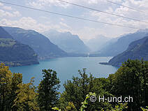 Finalmente arriviamo a Bauen. Alla fine del villaggio si arriva alla casa di Alberich Zwyssig, il compositore dell'inno nazionale svizzero. Qui inizia la salita attraverso la foresta verso Seelisberg. Su una vecchia mulattiera saliamo avventurosamente circa 850 gradini. La salita è in parte abbastanza ripida e con il caldo e i nostri muscoli doloranti anche molto faticosa. Quando la foresta si libera, si ha una magnifica vista del lago e del Fronalpstock sul lato opposto. Ogni tanto c'è una panchina dove si può fare un breve riposo. Una volta in cima, Mia si rinfresca nella fontana della piccola frazione di Brunni. Qui c'è anche una toilette.