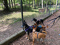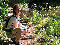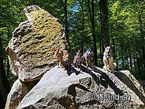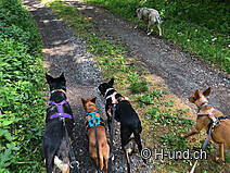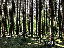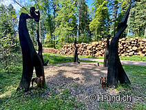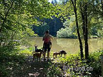 Poi seguì la quinta e come abbiamo trovato il più bello stagno (Cholmoos). Il resto del percorso è molto divertente e conduce attraverso il bellissimo Sagenweg (molto interessante) fino al punto di partenza del Wildpark. Anche lì si può fare una bella sosta alla capanna nel bosco. Nonostante il clima caldo il percorso è stato molto piacevole da percorrere. Ci sono sempre possibilità di raffreddamento per i cani. Ciononostante, i cani sono stati molto riconoscenti per l'acqua portata con sé.