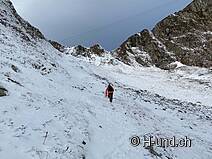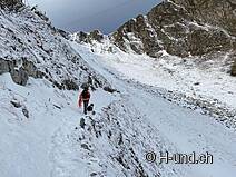 È abbastanza fresco e c'è già la neve. All'inizio si cammina all'ombra, ma si vede il sole sul fianco sud.