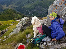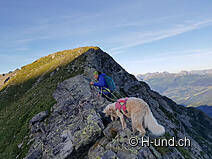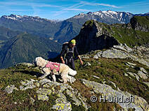 Dopo un viaggio avventuroso attraverso (!) il muro della diga del Lago die Luzzone e una strettissima Tunell, siamo partiti di prima mattina presto dal parcheggio alla fine della strada sterrata lungo il Bacino di Carassinos. Attraverso boschi radi abbiamo raggiunto in breve tempo la bella cresta di crinale tra la Val Benio e la Val di Carassino. Oltre la cresta inizialmente ripida, si guadagna rapidamente quota e si rimane sempre sorpresi da nuovi e magnifici panorami. Una volta raggiunta l'altezza, si cammina in un piacevole saliscendi verso la capanna Adula. Per alcuni brevi tratti di arrampicata abbiamo assicurato Zorro con una corda. La strada del ritorno alla macchina conduce lungo il fresco Ri di Carassino in cui il cane può raffreddarsi in qualsiasi momento.