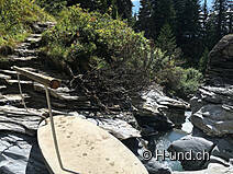 Il percorso è contrassegnato con Nr.764. Oltre i percorsi a zig zag, con molte radici, si guadagna rapidamente altezza. La sicurezza del piede a 2 e 4 gambe è molto importante, soprattutto nella parte inferiore. Così come la stima, dove si possono far entrare i cani in acqua. A Stargels (1590m) ho concesso ai miei 2 husky e a me una pausa caffè.