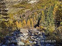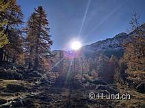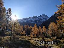 È possibile parcheggiare nel comune di Fäld in uno dei parcheggi a pagamento. Questo è anche il punto di partenza per il meraviglioso giro del lago Mässersee. Passato il Rock Experience Trail, il sentiero si snoda costantemente in alto attraverso bellissime foreste di pini cembri, che ora mostrano il loro lato migliore al sole d'autunno. Se si guarda con attenzione, si possono scoprire i diversi tipi di roccia, che brillano davvero a seconda della luce. Non si perde nemmeno il magnifico panorama delle montagne circostanti. La salita ne vale la pena, perché in cima vi aspetta il bellissimo lago Mässersee che, grazie alla sua bassa profondità, raggiunge una temperatura piacevole in estate e attira alcune persone per un bagno. Certo, ci si può anche nuotare in autunno, ma per noi era un po' troppo fresco. Siccome stava arrivando un vento più forte, abbiamo accorciato un po' la nostra pausa e abbiamo continuato il giro. Passato il lago, c'è un'altra piccola salita prima di ridiscendere dall'altra parte verso Fäld (parcheggio). Se lo desideri, puoi prolungare il tour quanto vuoi. Il sentiero è sicuro e facile da fare con un cane, ma è richiesto un passo sicuro. Non abbiamo incontrato nessuno durante tutto il percorso. Essendo una riserva naturale, i cani devono essere tenuti al guinzaglio.