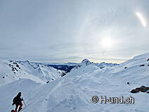 Si prende prima la cabinovia da Les Barzettes a Violettes e poi il "Funitel" fino a Plaine Morte. Il tour inizia qui. Dapprima si scende facilmente verso il ghiacciaio, poi si percorre un anello fino al ghiacciaio per poi ridiscendere alla stazione a monte.