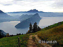 La seguente via del ritorno a Hinterbergen conduce di tanto in tanto attraverso le mucche (madri) (sentiero - non privo di barriere). Anche se siamo tutti piuttosto scettici nei confronti del pascolo, tutto procede a ritmo sostenuto. Fino a Hinterbergen abbiamo di nuovo un meraviglioso panorama ai nostri piedi. Se volete potete percorrere a piedi l'ultimo tratto fino a Vitznau (ca. 1,5 ore) o scendere con il treno privato (piccola cabinovia).