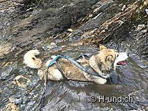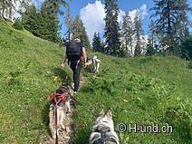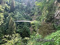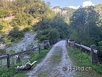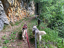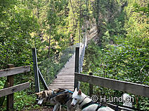 In seguito siamo andati sull'ultima parte del percorso verso il ponte sospeso. Avevo già visto delle immagini. Quindi sapevamo che la superficie è buona per i cani. Il ponte è lungo 67 metri e alto 45 metri nel punto più alto.