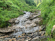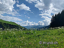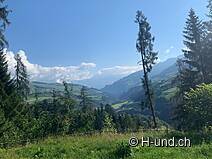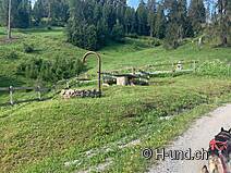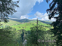 Qui è iniziato per noi l'inizio di questo tour. Al Valser Rhein, laggiù, c'è il primo camino. Per noi è andata avanti verso Surcasti, dove abbiamo seguito la segnaletica verso Schumials. Attraverso un pascolo vuoto, dove probabilmente si trovano le mucche in primavera e in autunno, siamo arrivati al camino Schumials, anch'esso molto invitante. E abbiamo seguito ulteriormente il sentiero per Silgin, dove abbiamo camminato lungo parti del bosco più e più volte.