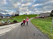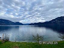 Ora si cammina in direzione di "Zopf", poi sempre lungo i cartelli verdi del "Sentiero di Helsana". Passando davanti a una fattoria, poi attraverso un campo, arriviamo presto al bellissimo Lago dei Quattro Cantoni. Percorriamo un breve tratto di strada poco frequentata fino alla stazione dei battelli di Hertenstein. Il panorama del lago e delle montagne circostanti è unico.